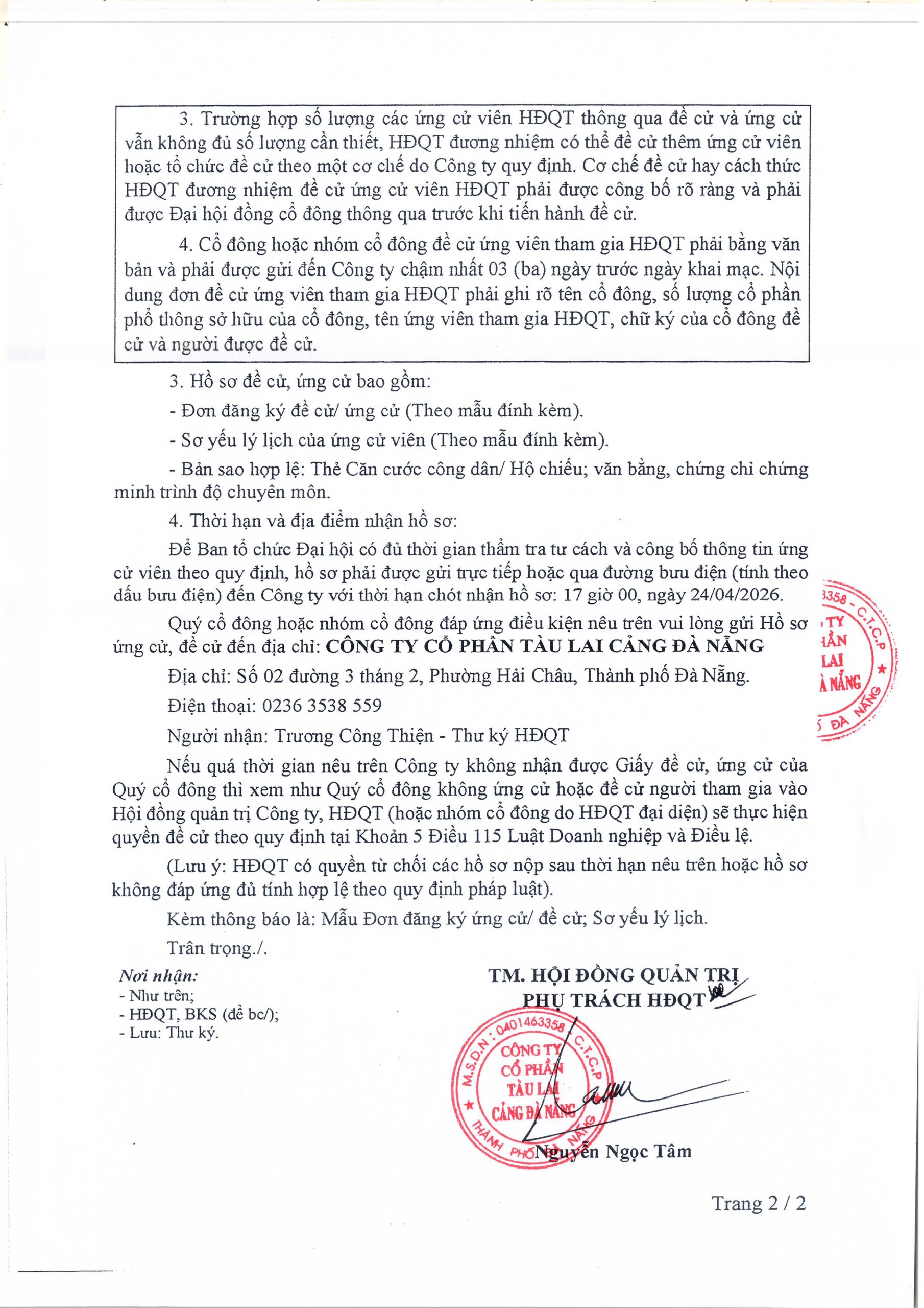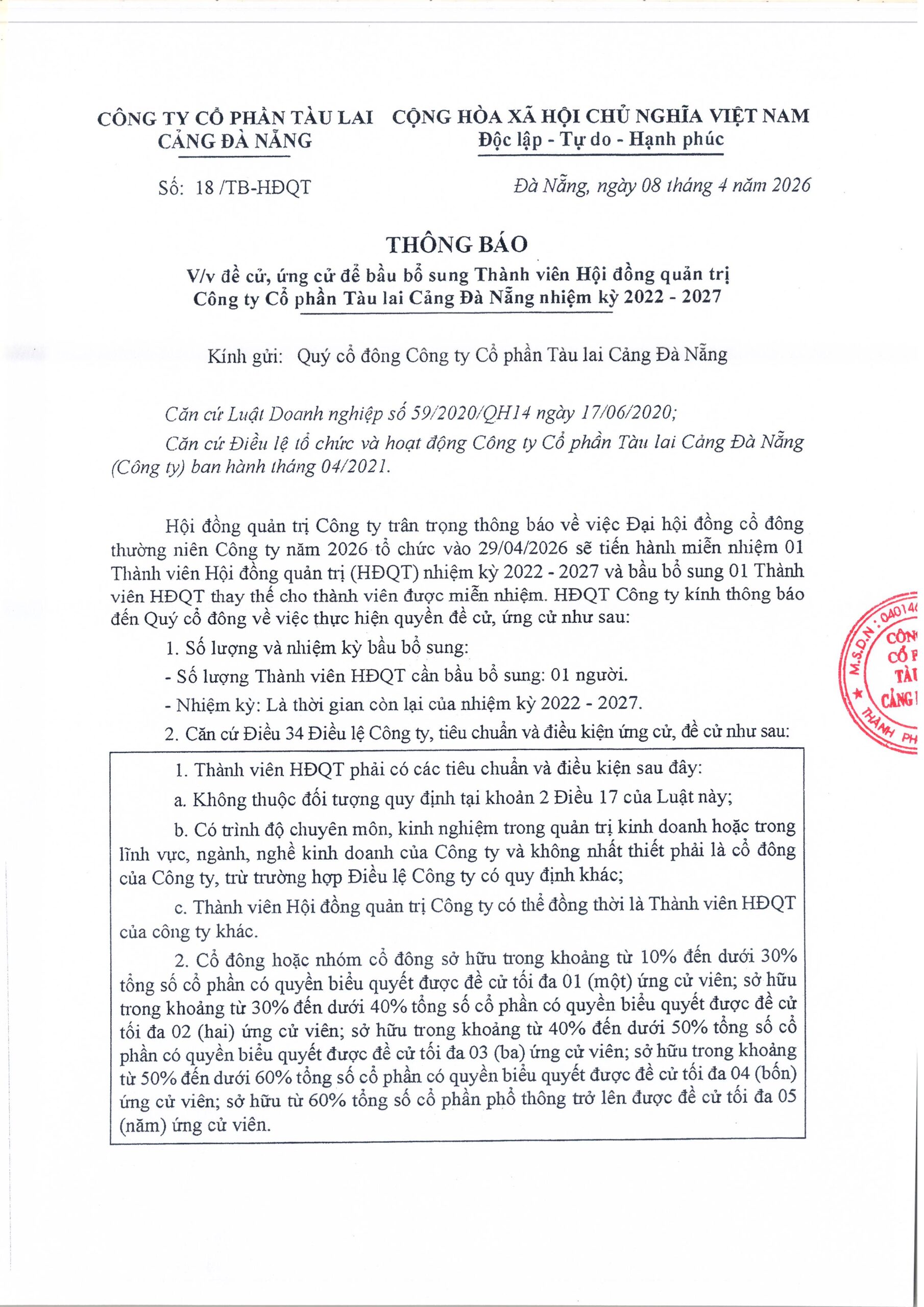 Quý cổ đông tải Thông báo về việc đề cử, ứng cử để bầu bổ sung Thành viên Hội đồng quản trị Công ty cổ phần Tàu Lai Cảng Đà Nẵng nhiệm kỳ 2022-2027 (kèm mẫu Đơn ứng cử, Đơn đề cử) tại đây